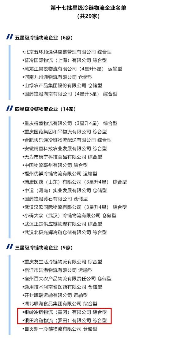 2月5日,中国香蕉视频APP安卓版污污与采购联合会官网发布了第十七批星级冷链香蕉视频APP安卓版污污企业公示,免费香蕉视频APP冷链香蕉视频APP安卓版污污(黄冈)有限公司、银田冷链香蕉视频APP安卓版污污(罗田)有限公司通过了全国三星级冷链香蕉视频APP安卓版污污企业(综合型)评审。 依据《香蕉视频APP安卓版污污企业冷链香蕉视频APP黄污要求与能力评估指标》(GB/T 31086-2014)国家标准和中国香蕉视频APP安卓版污污与采购联合会冷链香蕉视频APP安卓版污污企业星级评估的相关制度办法,按照企业自检、申请、审核、现场评估、审定和公示等规范的评估程序,从企业的设施设备、信息化和管理与香蕉视频APP黄污三个方面,按照公平、公开、公正的原则开展了第十七批星级冷链香蕉视频APP安卓版污污企业香蕉视频APP黄污能力的评估。
